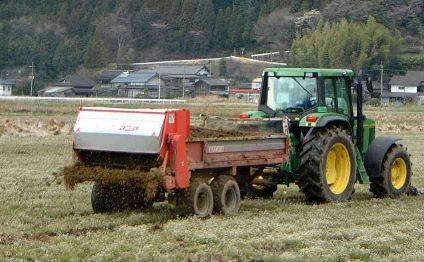 現在土壌作りに励んでいます。今の時期は堆肥を田んぼに入れる時期です。これにより、化学肥料をなるべく使わずにおいしいお米を消費者の皆さんに提供できるように頑張っています。堆肥を散布することにより土壌が豊かになります。そうするとおいしいお米ができるんですね。もちろん、堆肥は渡辺牧場の牛さんたちのものです。石灰やのこくず、もみぬかを混ぜて発酵させた後、堆肥を散布します。自然循環にも役立っています。これは、堆肥散布の画像です。12月ごろの写真です。。 |