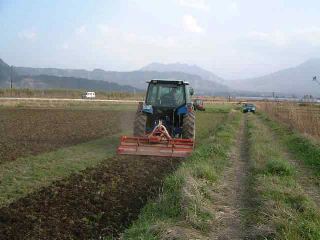 田起こしの風景です。根子岳も見えるでしょ。田起こしをすることで稲を植えやすいようにしています。昔は鍬(くわ)をつかって田起こしをしていたんですよ。農作業も楽になりました。でも、設備投資の借金で苦しいけど。この画像は、4月に撮ったものです。堆肥散布をした田んぼとは違う田んぼですが、阿蘇五岳の一つ、根子岳が写っているのでそこのとこはお許しを。